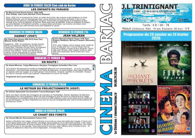 Séances cinéma à Barjac du 28 janvier au 24 février