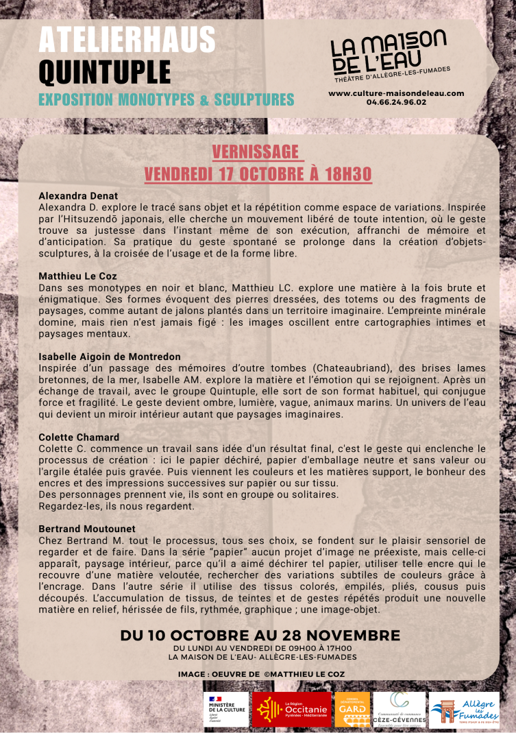 Du vendredi 10 octobre au vendredi 28 novembre, Exposition de l'AtelierHaus à La maison de l'Eau à Allègre les Fumades: monotypes et sculptures.
