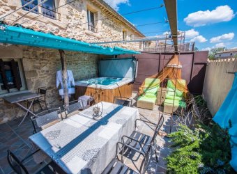 - équipements: barbecue, terrain de pétanque, piscine couverte et commune, climatisation, équipements bien-être (bains à remous, balnéothérapie, espace spa), cour et jardin communs, terrain clos et ombragé, terrasse, abris vélo/VTT, parking privé
